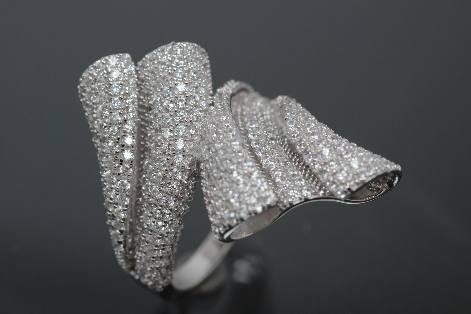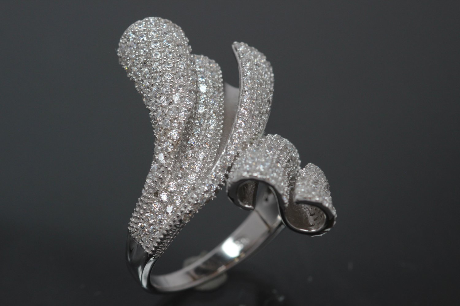 aLEm Ring "Glitzernde wilde Wellen - Glittering Wild Waves" 925/- Silber rhodiniert mit weißen Zirkonia, ca.Maße Ringkopf L21,2mm, B32,3mm, H8,9mm, Ringschiene B2,6mm bis 5,0mm, MS1,3mm, Ringgröße Weite 52 (ca.Maße wurden an der höchsten und breitesten und stärksten Seite bzw. Fläche gemessen.) Das Ringdesign stellt symbolisch zwei wilde brechende Wellen dar. Angelehnt an stürmisch aufbeumende Wassermassen wurden die Schaumkronen stilistisch durch weiße runde funkelnde Zirkonia mit Brillantschliff dargestellt, welche man Stein an Stein im Verschnitt eingefasst hatte. Dieses Ringdesign ist ein fester Bestandteil der exklusiven Kollektion " Exclusivity by alain LE mondial " Nobless Oblige. Die Oberfläche wurde poliert und zum Schutz des Grundmetalles 925/- Sterlingsilber sowie als zusätzlichen Anlaufschutz galvanisch mit hochwertigem Rhodium veredelt. Gewicht per Stück ca. 10,6gr