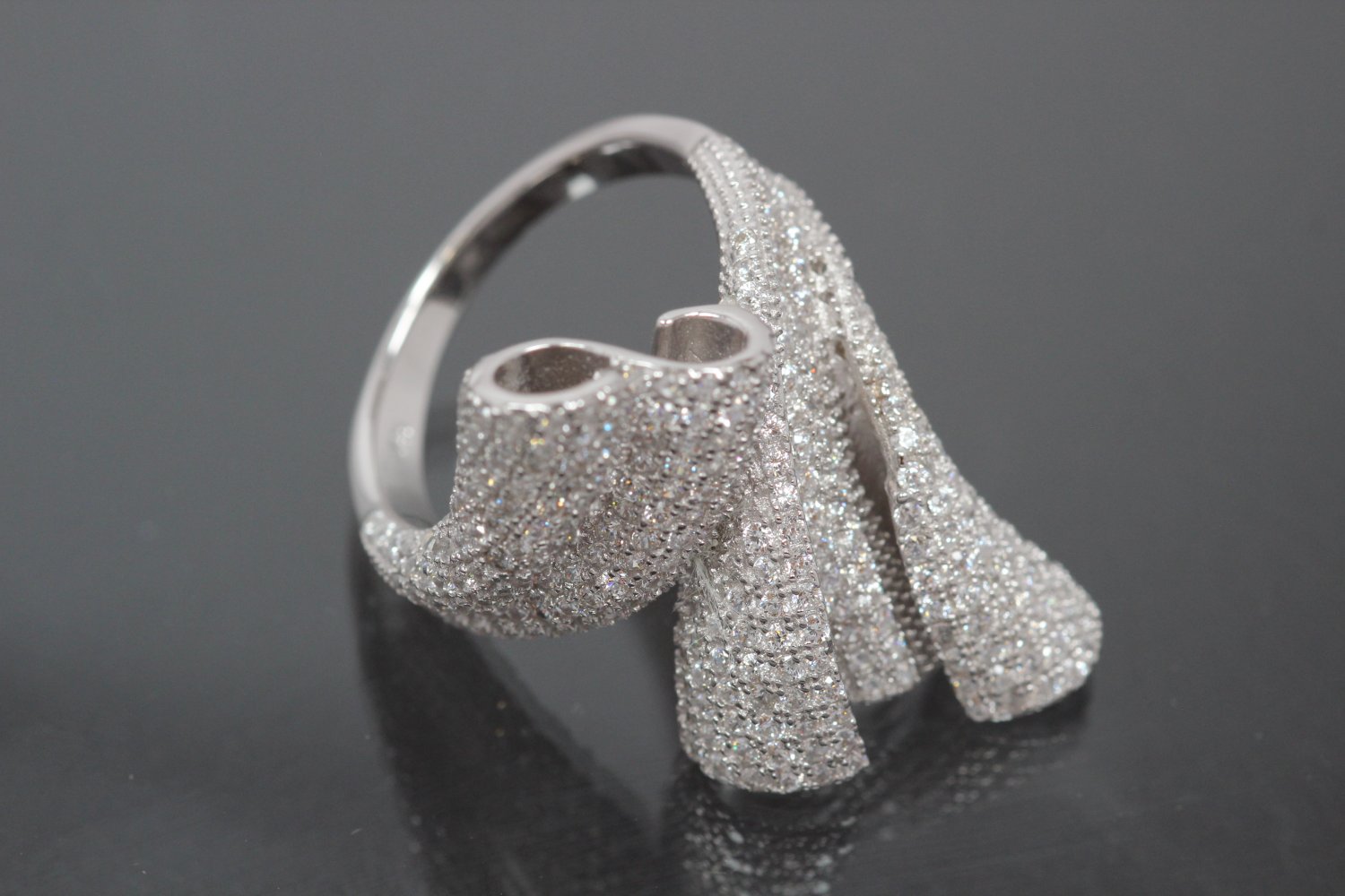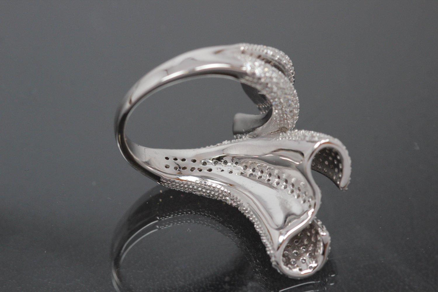 aLEm Ring "Glitzernde wilde Wellen - Glittering Wild Waves" 925/- Silber rhodiniert mit weißen Zirkonia, ca.Maße Ringkopf L21,2mm, B32,3mm, H8,9mm, Ringschiene B2,6mm bis 5,0mm, MS1,3mm, Ringgröße Weite 58 (ca.Maße wurden an der höchsten und breitesten und stärksten Seite bzw. Fläche gemessen.) Das Ringdesign stellt symbolisch zwei wilde brechende Wellen dar. Angelehnt an stürmisch aufbeumende Wassermassen wurden die Schaumkronen stilistisch durch weiße runde funkelnde Zirkonia mit Brillantschliff dargestellt, welche man Stein an Stein im Verschnitt eingefasst hatte. Dieses Ringdesign ist ein fester Bestandteil der exklusiven Kollektion " Exclusivity by alain LE mondial " Nobless Oblige. Die Oberfläche wurde poliert und zum Schutz des Grundmetalles 925/- Sterlingsilber sowie als zusätzlichen Anlaufschutz galvanisch mit hochwertigem Rhodium veredelt. Gewicht per Stück ca. 10,9gr