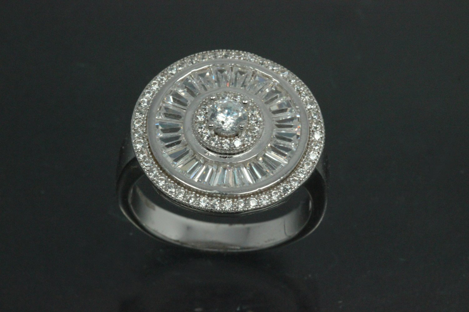 aLEm Ring "Global World Circle " mit weißen Zirkonia 925/- Silber rhodiniert, ca.Maße Ringkopf L19,7mm, B19,7mm, H5,7mm, Ringschiene B4,0mm, MS1,1mm, Ringgröße Weite 55, (ca.Maße wurden an der höchsten und breitesten und stärksten Seite bzw. Fläche gemessen.) Dieser Ring wurde dem Markenzeichen " alain LE mondial " und dessen Bedeutung alain der Weltweite gewidmet. Die Halbkugel in der Mitte stellt unsere Welt dar und wurde deshalb mit weißen runden facettierten funkelnden Zirkonia im Brillantschliff im Verschnitt gefasst, umringt von einem Weg der aus vielen facettierten funkelnden Baquettzirkonia symbolisiert wurde. Der äußerste Ring erhielt einen Reihenverschnitt bestehend aus vielen kleinen facettierten funkelnden Zirkonia der unsere Atmosphäre rund um die Welt darstellt. Die Außenkante der Rückseite erhielt einen goldschmiedisch fachmännisch ausgearbeiteten Luftkader aufgelötet. Dieser ausgefallene Ring zählt zum festen Bestandteil der exklusiven Kollektion " Exclusivity by alain LE mondial " Nobless Oblige. Die Oberfläche wurde poliert und zum Schutz des Grundmetalles 925/- Sterlingsilber sowie als zusätzlichen Anlaufschutz galvanisch mit hochwertigem Rhodium veredelt. Gewicht per Stück ca. 6,7gr