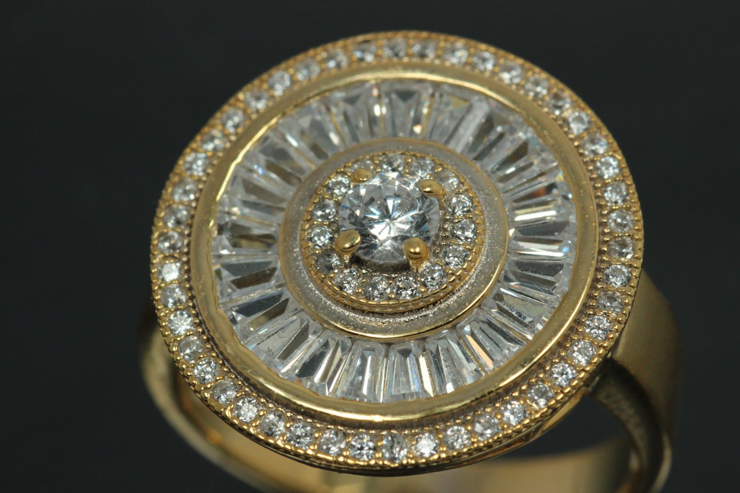 aLEm Ring "Global World Circle " mit weißen Zirkonia 925/- Silber vergoldet, ca.Maße Ringkopf L19,7mm, B19,7mm, H5,7mm, Ringschiene B4,0mm, MS1,1mm, Ringgröße Weite 54, (ca.Maße wurden an der höchsten und breitesten und stärksten Seite bzw. Fläche gemessen.) Dieser Ring wurde dem Markenzeichen " alain LE mondial " und dessen Bedeutung alain der Weltweite gewidmet. Die Halbkugel in der Mitte stellt unsere Welt dar und wurde deshalb mit weißen runden facettierten funkelnden Zirkonia im Brillantschliff im Verschnitt gefasst, umringt von einem Weg der aus vielen facettierten funkelnden Baquettzirkonia symbolisiert wurde. Der äußerste Ring erhielt einen Reihenverschnitt bestehend aus vielen kleinen facettierten funkelnden Zirkonia der unsere Atmosphäre rund um die Welt darstellt. Die Außenkante der Rückseite erhielt einen goldschmiedisch fachmännisch ausgearbeiteten Luftkader aufgelötet. Dieser ausgefallene Ring zählt zum festen Bestandteil der exklusiven Kollektion " Exclusivity by alain LE mondial " Nobless Oblige. Die Oberfläche wurde poliert und zum Schutz des Grundmetalles 925/- Sterlingsilber sowie als zusätzlichen Anlaufschutz galvanisch mit hochwertigem Gold veredelt. Gewicht per Stück ca. 6,6gr