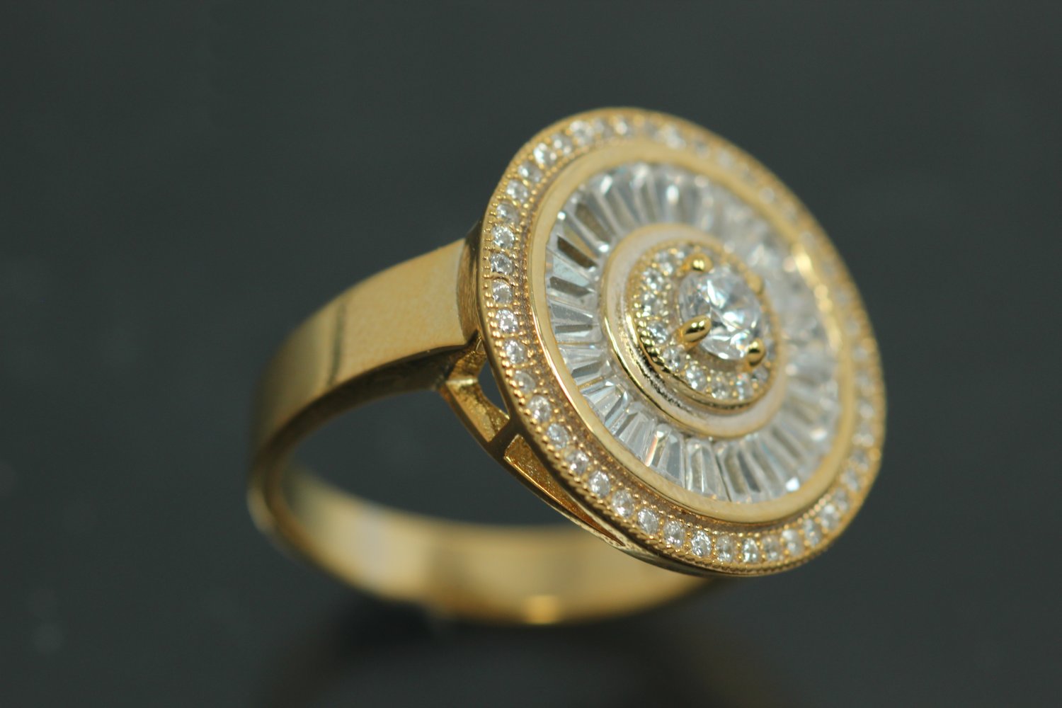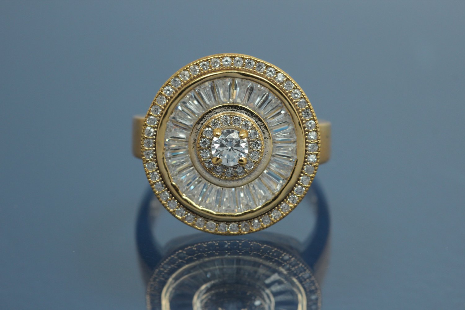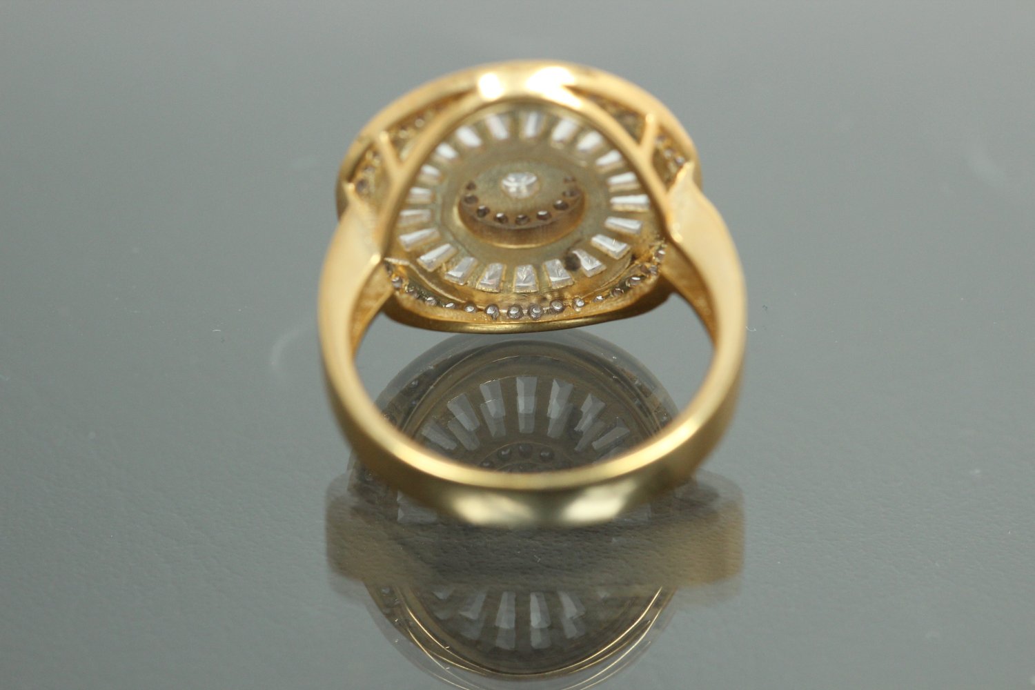 aLEm Ring "Global World Circle " mit weißen Zirkonia 925/- Silber vergoldet, ca.Maße Ringkopf L19,7mm, B19,7mm, H5,7mm, Ringschiene B4,0mm, MS1,1mm, Ringgröße Weite 58, (ca.Maße wurden an der höchsten und breitesten und stärksten Seite bzw. Fläche gemessen.) Dieser Ring wurde dem Markenzeichen " alain LE mondial " und dessen Bedeutung alain der Weltweite gewidmet. Die Halbkugel in der Mitte stellt unsere Welt dar und wurde deshalb mit weißen runden facettierten funkelnden Zirkonia im Brillantschliff im Verschnitt gefasst, umringt von einem Weg der aus vielen facettierten funkelnden Baquettzirkonia symbolisiert wurde. Der äußerste Ring erhielt einen Reihenverschnitt bestehend aus vielen kleinen facettierten funkelnden Zirkonia der unsere Atmosphäre rund um die Welt darstellt. Die Außenkante der Rückseite erhielt einen goldschmiedisch fachmännisch ausgearbeiteten Luftkader aufgelötet. Dieser ausgefallene Ring zählt zum festen Bestandteil der exklusiven Kollektion " Exclusivity by alain LE mondial " Nobless Oblige. Die Oberfläche wurde poliert und zum Schutz des Grundmetalles 925/- Sterlingsilber sowie als zusätzlichen Anlaufschutz galvanisch mit hochwertigem Gold veredelt. Gewicht per Stück ca. 6,7gr