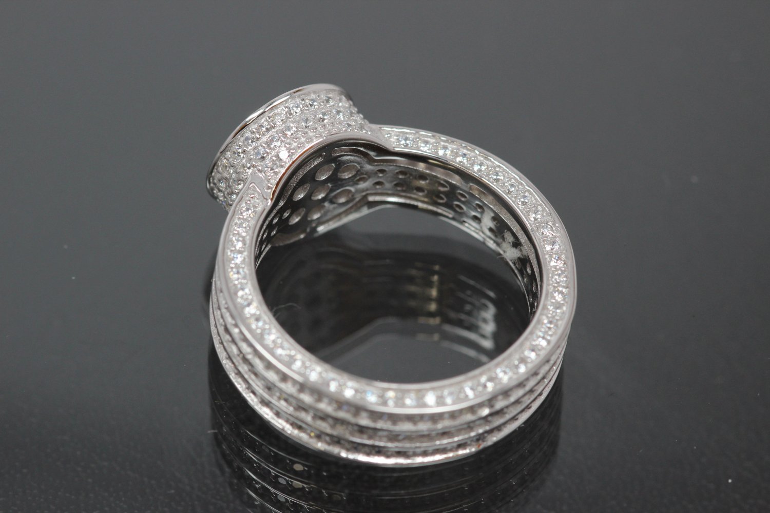 aLEm Ring "alain LE mondial" 925/- Silber rhodiniert mit weißen Zirkonia, ca.Maße Ringkopf L11,1mm, B11,1mm, H5,9mm, Ringschiene B6,4mm, MS2,4mm, Ringgröße Weite 56 (ca.Maße wurden an der höchsten und breitesten und stärksten Seite bzw. Fläche gemessen.) Als besonderes Merkmal besticht dieses ganzheitlich im Verschnitt ausgefasste Ringdesign mit hoher Exklusivität. Es muss hier betont werden, dass der Ringkopf sowie sämtliche Außenflächen mit weißen runden funkelnden Zirkonia mit Brillantschliff Stein an Stein ausgefasst wurden. Die Innenseite hatte man in meisterlicher Goldschmiedearbeit rundum mit einem herrlichen Kader ausgestaltet. Dieses Ringdesign ist ein fester Bestandteil der exklusiven Kollektion " Exclusivity by alain LE mondial " Nobless Oblige. Die Oberfläche wurde poliert und zum Schutz des Grundmetalles 925/- Sterlingsilber sowie als zusätzlichen Anlaufschutz galvanisch mit hochwertigem Rhodium veredelt. Gewicht per Stück ca. 6,7gr