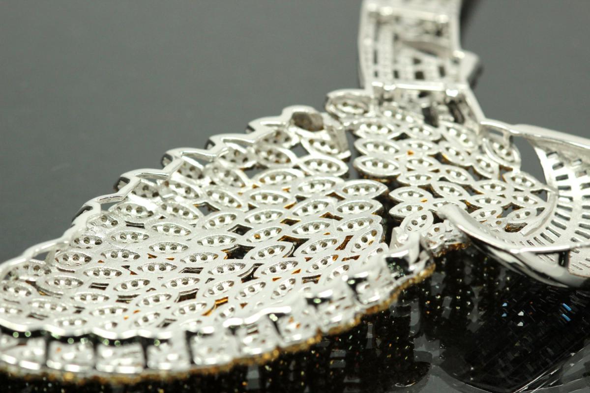 aLEm Collier, Hochzeitsflügel mit weiße und gelbe Zirkonia 925/- Silber rhodiniert, ca.Maße L 50cm, ca.Maße Colliermittelteil H 88,0mm, Breite 40,0mm, MS 6,5mm, ca.Maße Collier im Verlauf 6,0mm bis 13,0mm, MS 2,5mm bis 4,0mm (ca.Maße wurden an der höchsten und breitesten und stärksten Seite bzw. Fläche gemessen.) Wer liebt, dem wachsen Flügel - unter diesem Aspekt steht das opulent ausgearbeitete Mittelteil im Design eines symbolischen Engelsflügels. Mit seinen in gelb gehaltenen, funkelnden Zirkonia in Brillantschliff soll dieser Flügel seine beschützende Bedeutung in den Dienst der Liebe zweier heiratenden Menschen stellen. Dabei wird der Flügel von angedeuteten Eheringen, welche mit strahlenden Zirkonia in Baquettschliff ausgefasst sind, als zusätzliches Zeichen der Verbundenheit fest umklammert. Dieses ausgefallene Hochzeitscollier in Gestaltung, Design und Ausführung ist ein fester Bestandteil der exklusiven Kollektion " Infinite Love by alain LE mondial " Nobless Oblige und mit weißen runden facettierten und funkelnden Zirkonia mit Brillantschliff im Verschnitt am rechten und linken Seitenansatz gefasst. Die Anordnung der beweglichen Collierteile wurden im Verlauf mit viel Liebe zum Detail zum Mittelteil hin ausgerichtet. Ein Kastenschloß mit Sicherungsacht krönte die Fertigung. Die Oberfläche wurde poliert und zum Schutz des Grundmetalles 925 /- Sterlingsilber und als zusätzlichen Anlaufschutz galvanisch mit hochwertigem Rhodium veredelt. Gewicht per Stück ca.71,1gr