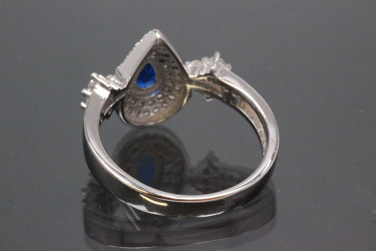 aLEm Ring "Tropfen der Mitternacht - Teardrop of Midnight" mit safirfarbenen und weißen Zirkonia 925/- Silber rhodiniert, ca.Maße Ringkopf L19,5mm, B13,4mm, H4,2mm, Ringschiene B3,3mm, MS1,3mm, erhältlich in verschiedenen Ringweiten (ca.Maße wurden an der höchsten und breitesten und stärksten Seite bzw. Fläche gemessen.)In einigen Kulturen bedeutet es ein großes Eheglück für das Brautpaar, wenn es am Hochzeitstag regnet. Der Ring Teardrop of Midnight – Tropfen der Mitternacht - soll dem zukünftigen Brautpaar dieses Glück mit in die Ehe bringen. Ausgehend vom tropfenförmigen Mittelteil, welches mit einem exklusiven saphirblauen Zirkonia in einer Krappenfassung mit im Verschnitt ausgefasstem Rand versehen wurde, folgen weitere glückbringende Regentropen aus ebenfalls im Verschnitt gefassten funkelnden runden Zirkonia. Auslaufend wechseln sich rechts und links einzeln im Verschnitt gefasste weiße Zirkonia, welche ebenfalls kleine Regentropfen symbolisieren sollen, als herzförmiges Seitenteil rechts und links des Ringkopfes ab. Der gesamte Ringkopf wurde meisterlich dem Design der Ringschiene angepasst. Dieses Schmuckstück mit seinem ganzen Charme ist ein fester Bestandteil der exklusiven Hochzeitsschmuck - Kollektion " Infinite Love by alain LE mondial " Noblesse Oblige. Die Oberfläche wurde poliert und zum Schutz des Grundmetalles 925/- Sterlingsilber und als zusätzlichen Anlaufschutz galvanisch mit hochwertigem Rhodium veredelt. Gewicht per Stück ab ca.3,4gr