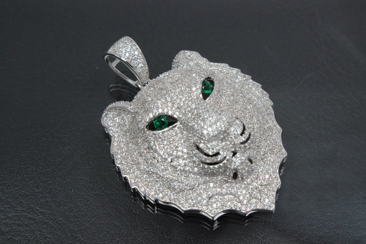 aLEm Anhänger Löwe "König der Steppe" mit weißen und grünen smaragdfarbenen Zirkonia 925/- Silber rhodiniert, ca.Maße H 56,0mm incl.Schlaufe, B 39,0mm, MS 15,1mm, Schlaufe innen H 9,0mm, B 5,5mm, (ca.Maße wurden an der höchsten und breitesten und stärksten Seite bzw. Fläche gemessen.) Âls Exclusivität besitzt der Löwenkopfanhänger auf der Rückseite des Kopfes einen schönen in Goldschmiedekunst gefertigten Kader mit vielen ausgesägten Karo als Ornamente. Der Löwenkopf "König der Steppe" wurde in diesem Modell und Design mit viel Liebe zum Detail gearbeitet und der Natur nachempfunden. Der Gesichtsausdruck zeigt seine gefährliche Mimik, die seinem Ruf als Raubtier und Herrscher der Steppe gerecht wird. Seine volluminöse Mähne sowie das gesamte Gesicht wurde auf der Frontseite somit Sichtseite des Löwenkopfes mit weißen runden funkelnden facettierten Zirkonia mit Brillantschliff, Stein für Stein im Verschnitt gefasst. Die Vorderseite der Schlaufe wurde ebenfalls gefasst die Rückseite dagegen poliert. Als besonderen Kontrast und Hervorhebung wurden in die Augen grüne smaragdfarbene facettierte runde funkelnde Zirkonia eingearbeitet. Dieser Tieranhänger ist ein fester Bestandteil der exklusiven Kollektion " Wild Life by alain LE mondial " Noblesse Oblige Zum Schutz des Grundmetalles 925/- Sterlingsilber und als zusätzlichen Anlaufschutz galvanisch mit hochwertigem Rhodium veredelt. Gewicht per Stück ca.23,4gr