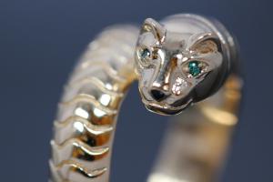aLEm Ring "Schleichender Tiger - Sneaking Tiger" 925/- Silber vergoldet mit smaragdfarbenen grünen Zirkonia, ca.Maße Ringkopf L15,2mm, B12,9mm, H5,9mm, Ringschiene B5,5mm, MS1,6mm, erhältlich in verschiedenen Ringgrößen (ca.Maße wurden an der höchsten und breitesten und stärksten Seite bzw. Fläche gemessen.) Als Besonderheit wurde dieser Tigerring dem Krafttier naturgetreu nachempfunden. In die Augen hatte man smaragdfarbene grüne Zirkonia eingearbeitet. Auf seinem Rücken wurden die schwarzen Streifen des außergewöhnlichen Fells in Form einer Nut eingearbeitet. Der elegante Tiger ist kämpferisch und abenteuerlustig. Der Tiger symbolisiert Kraft und Individualität, er repräsentiert Spirit, Leidenschaft, Wildheit und Macht. Dieses Ringdesign ist ein fester Bestandteil der exklusiven Kollektion " Wild Life by alain LE mondial " Noblesse Oblige. Die Oberfläche wurde poliert und zum Schutz des Grundmetalles 925/- Sterlingsilber sowie als zusätzlichen Anlaufschutz galvanisch mit hochwertigem Gold veredelt. Gewicht per Stück ab ca. 6,2gr